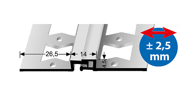 Profil pro dilataci podlahových krytin o tloušťce do 4,5 mm. Je určen pro dilataci podlahových krytin nad konstrukčními dilatacemi podkladu.