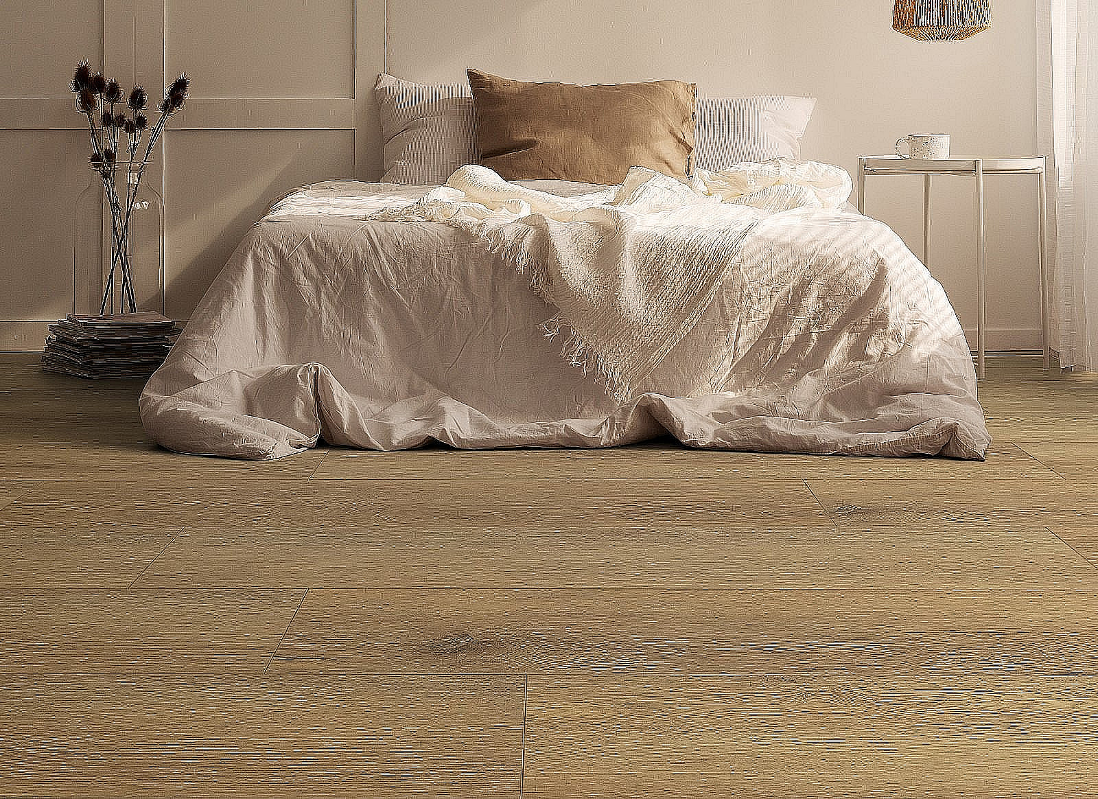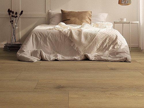 Ložnice není extrémně zatěžovaná, ale zásadní je pohodlí. Podlaha by měla být příjemná na dotek, tichá a opticky uklidňující.