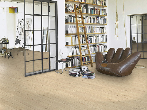 Jednotná podlaha v celém domě opticky zvětšuje prostor, eliminuje přechodové lišty a působí čistěji. Navíc je došlap výrazně příjemnější než u studené dlažby. Vhodným řešením do vlhkých prostor je například Floor Forever Design Vinyl Extreme.